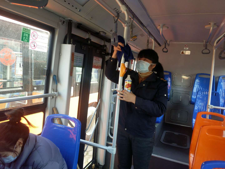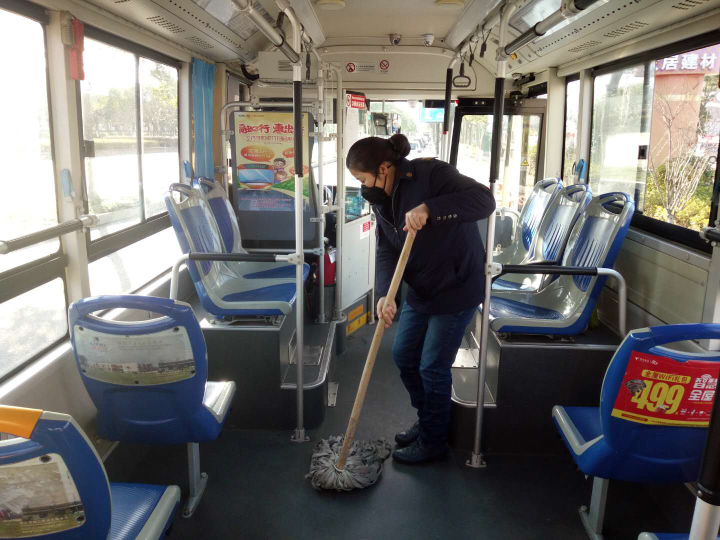 車(chē)輛每到終點(diǎn)站,童立杰都會(huì)認(rèn)真按照防疫工作流程操作,一絲不茍地把車(chē)廂地板、扶手、座椅等各個(gè)角落打掃擦試得干干凈凈,她說(shuō):"多消毒一次車(chē)廂,心里便多一分踏實(shí)。在這個(gè)特殊時(shí)期,能為乘客的健康出行出點(diǎn)力,是應(yīng)該的。"