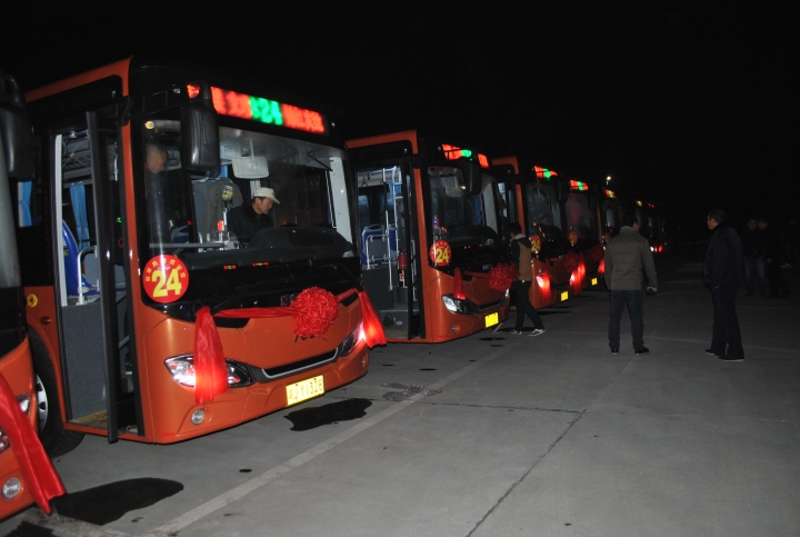 圖為嶄新的24路純電動公交車列隊待發(fā)