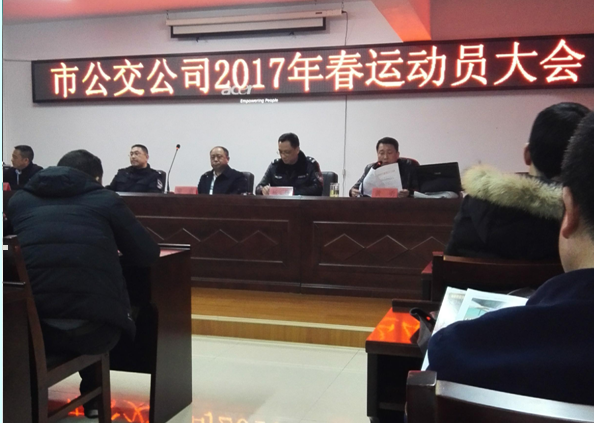2017年1月6日晚,市公交公司2017年春運動員大會在公交公司2樓大會議室召開。公司副總經(jīng)理廖惠、相關(guān)部門負(fù)責(zé)人、線路隊長以及300多名司乘人員參加了本次動員大會。市交警一大隊副大隊長楊軍輝、綜合股股長袁其軍應(yīng)邀出席大會并作講話。