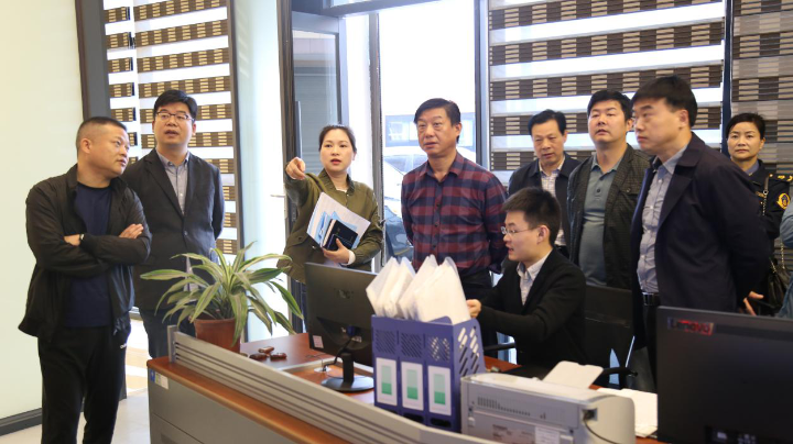 圖為交通運(yùn)輸局局長(zhǎng)向美華(左四)一行正在視察出租車政府監(jiān)管平臺(tái)