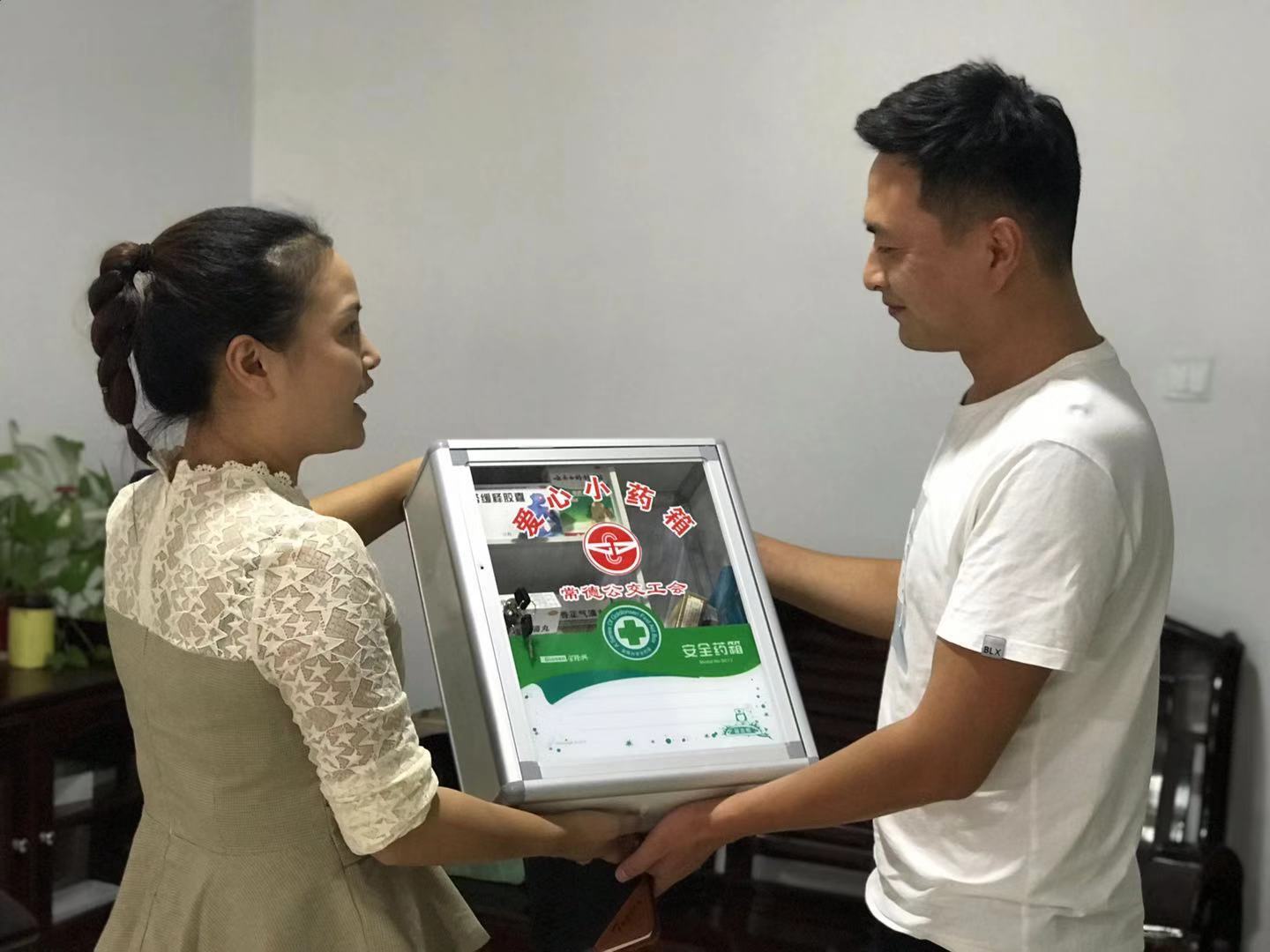 圖為分公司負(fù)責(zé)人來(lái)工會(huì)領(lǐng)取愛(ài)心小藥箱