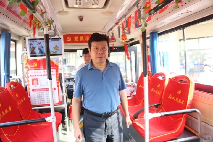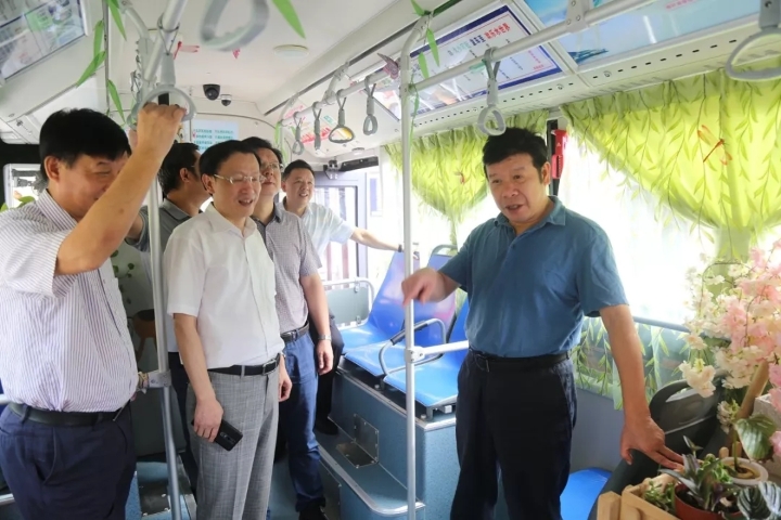 圖為領(lǐng)導(dǎo)一行觀摩常德公交33路線(黨員示范線)車輛