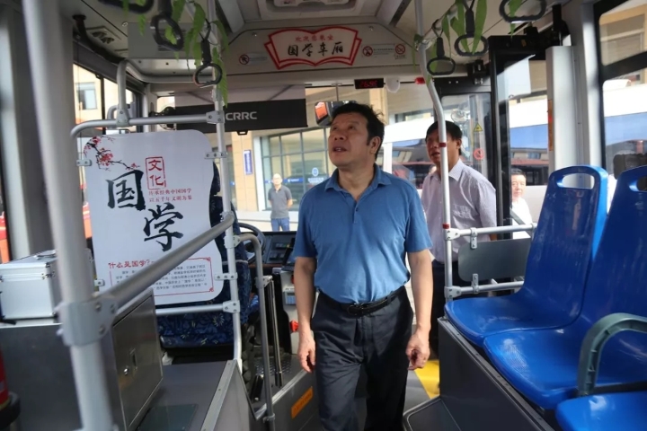 圖為領(lǐng)導(dǎo)一行觀摩常德公交47路線國學(xué)車廂