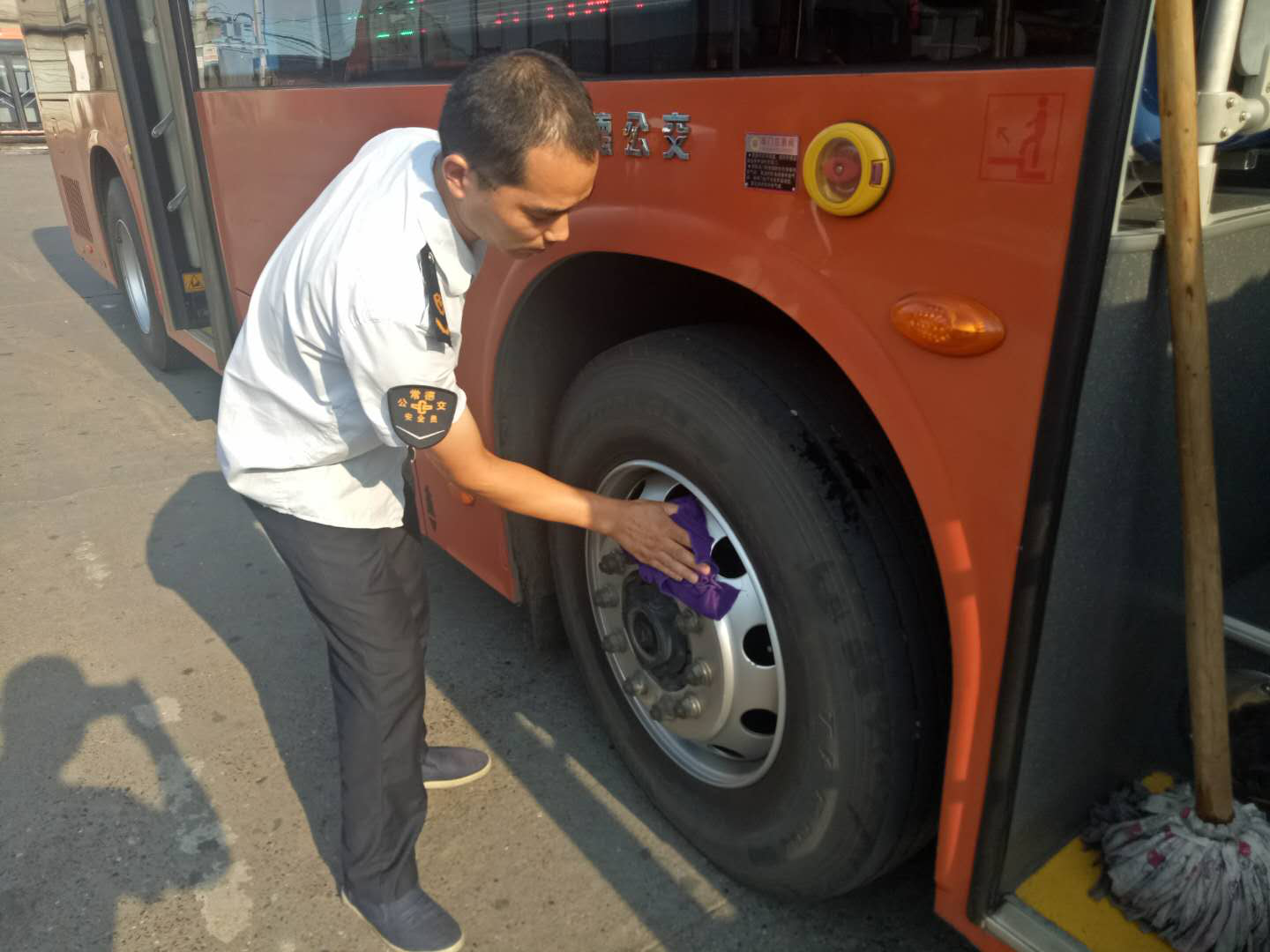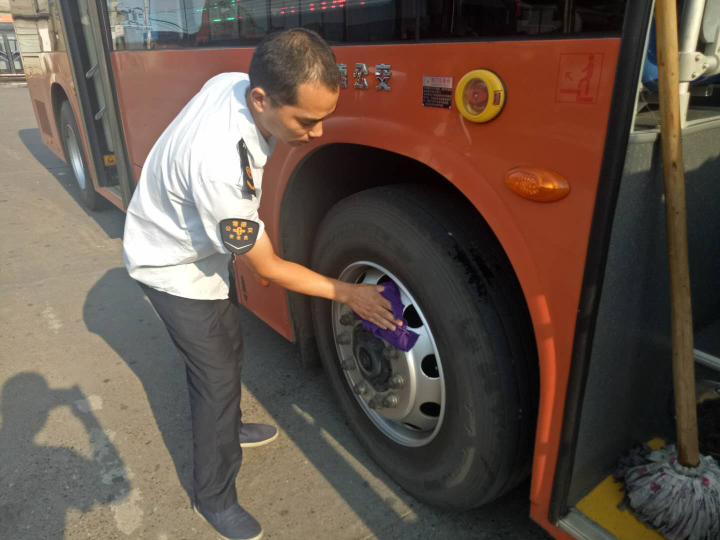 1路線駕駛員金師傅每天早上發(fā)車前就對自己駕駛的公交車進行衛(wèi)生清查,確保車內(nèi)座椅無破損,物品擺放整齊,線路走向圖、票價表、滅火器、安全錘齊全,車身整潔干凈無各類小廣告,確保全車不留任何衛(wèi)生死角。