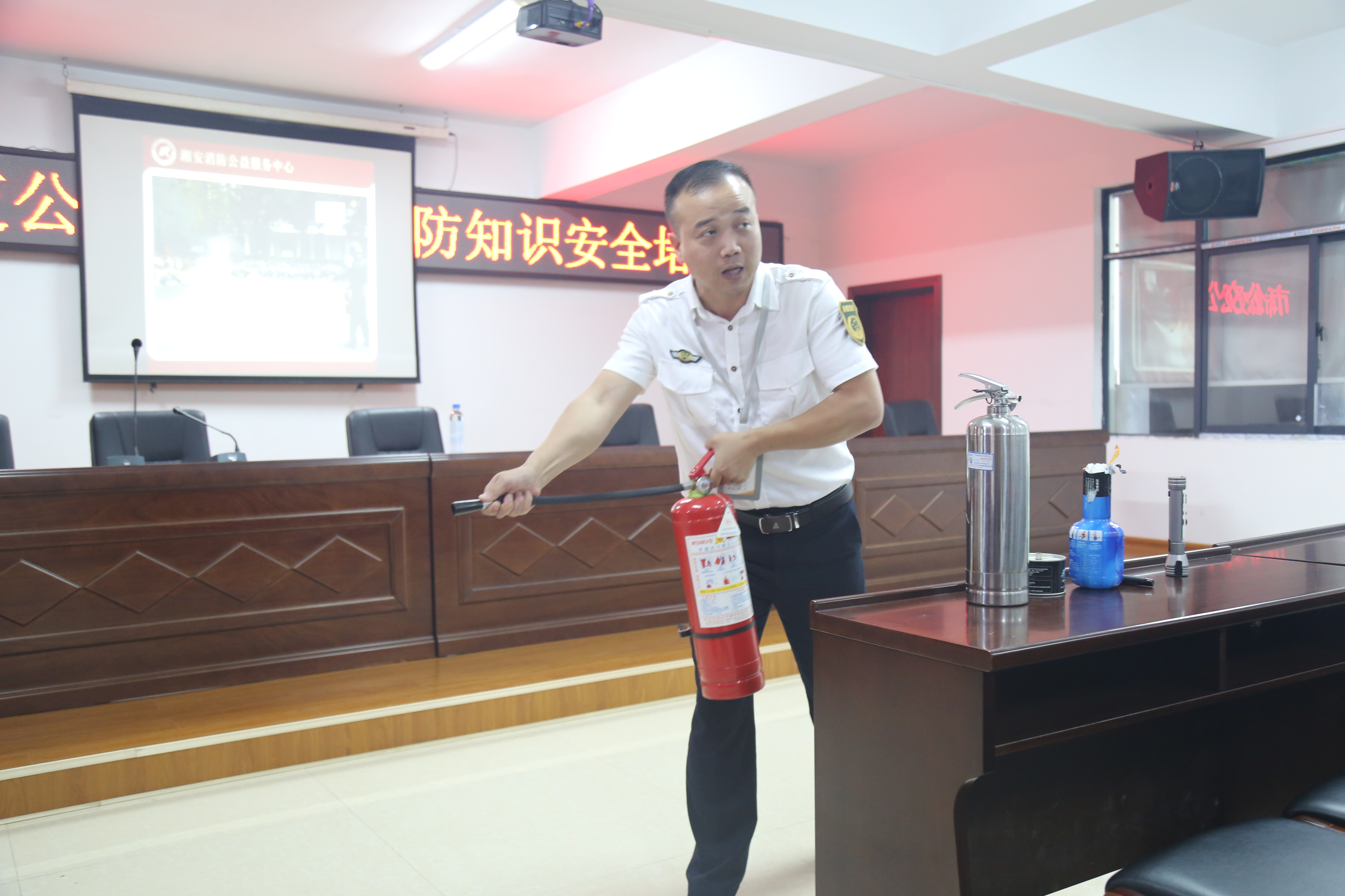 圖為培訓(xùn)現(xiàn)場(chǎng)彭教官正為公司干職員工講解滅火器正確使用方法