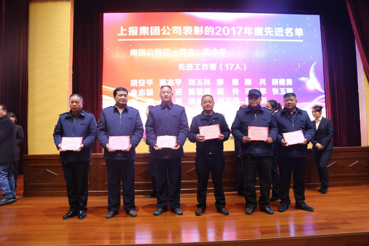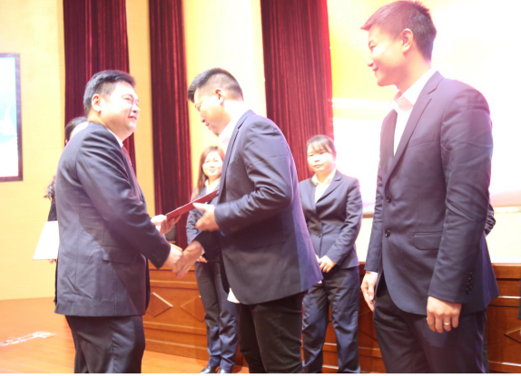 圖為公司總經(jīng)理胡安平(左前)正在為優(yōu)秀個(gè)人頒獎(jiǎng)