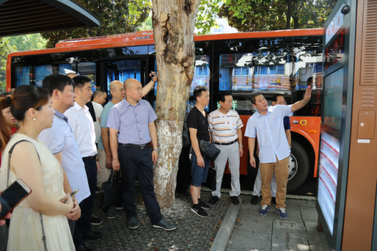 圖為調(diào)研團(tuán)一行在觀摩智能電子站牌