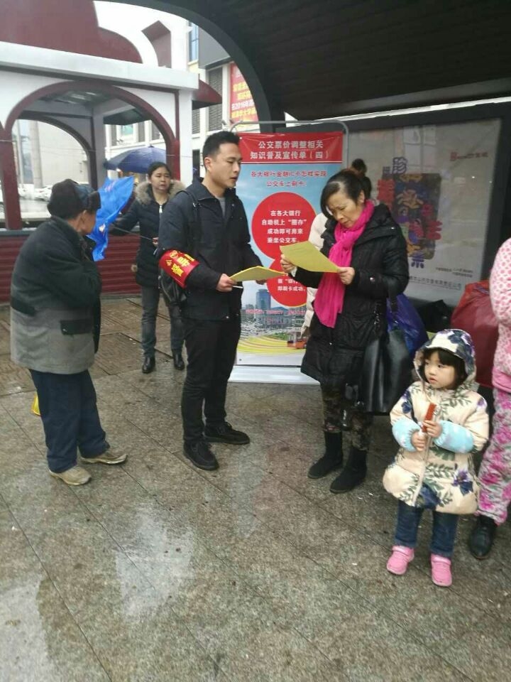 根據(jù)市發(fā)改委相關(guān)文件批復(fù),自2017年1月1日起,常德市城區(qū)實(shí)行新公交票價制度,市民乘坐公交車將不分季節(jié),統(tǒng)一實(shí)行全年一票制,票價為2元/人次(H5線除外),刷卡享受7.5折優(yōu)惠。為切實(shí)做好公交票價調(diào)整宣傳工作,市公交公司于2016年12月24日、25日,組織公司16名青年志愿者到城區(qū)客流較集中的市農(nóng)業(yè)局站、甘露寺站、下南門步步高站、朗州路郵電局站、公交總站、橋南市場東大門站及善卷路站7個站點(diǎn)開展了公交票價調(diào)整宣傳活動?;顒赢?dāng)天氣溫寒冷,凍雨不斷,但是志愿者卻不畏嚴(yán)寒,不怕辛苦,認(rèn)真在各自分管的站點(diǎn)積極向過往市民發(fā)放相關(guān)宣傳資料,并面對面為市民耐心宣講公交票價調(diào)整、辦卡網(wǎng)點(diǎn)、優(yōu)惠乘車及臨時公交卡購買、使用等相關(guān)知識。活動現(xiàn)場人潮涌動,熱鬧非凡,吸引了廣大市民駐足詢問,大部分市民對公交票價調(diào)整表示理解與支持,同時也希望公交公司能提供更加貼心、優(yōu)質(zhì)的乘車服務(wù)。據(jù)悉,為增進(jìn)此次宣傳活動效果,市公交公司還將于元月1日至5日,在市城區(qū)各站點(diǎn)跟進(jìn)開展站臺服務(wù)活動。