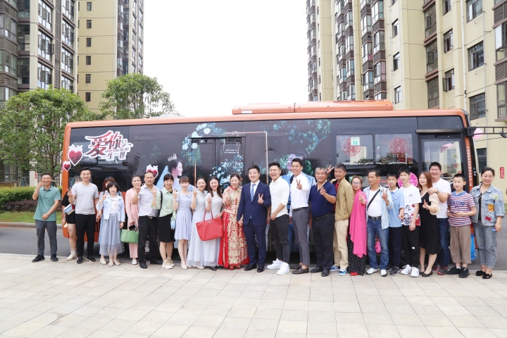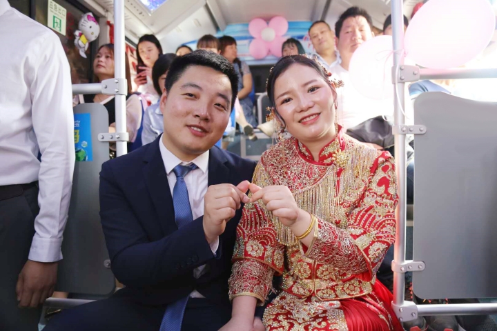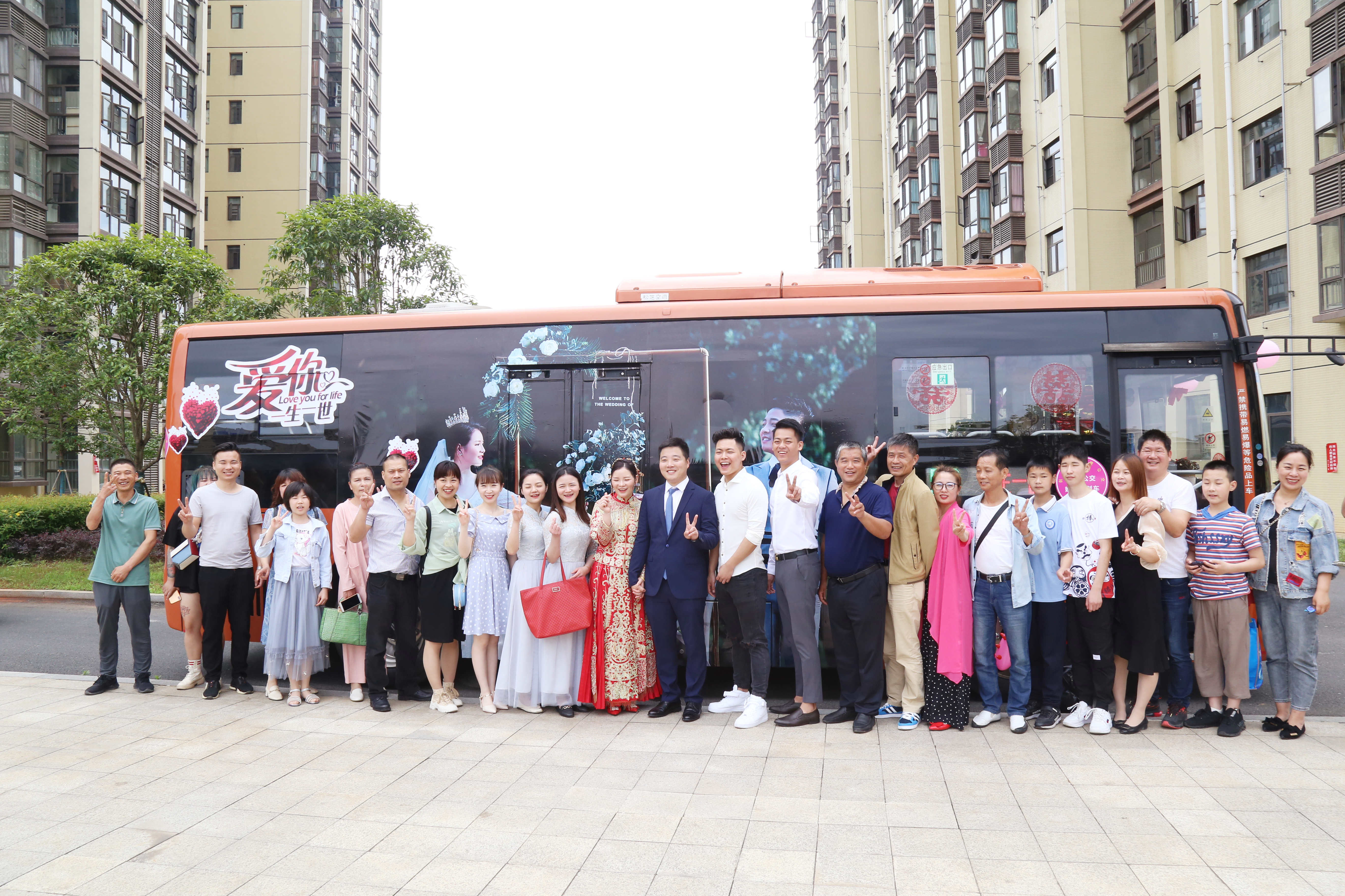 5月22日上午10時,一輛車身張貼著婚禮海報,車內(nèi)懸掛著彩色拉花和氣球,車載顯示屏播放著“520一生一世”的公交車緩緩駛?cè)虢?jīng)開區(qū)瑤湖苑小區(qū)。隨后車廂內(nèi)響起了浪漫的音樂,一對身穿中式婚禮服的美麗新娘與新郎,在親朋好友的簇?fù)硐戮彶降侨搿皭邸钡能噹?/span>