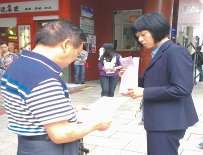 (圖為公司青年員工在育英小學向市民發(fā)放二期路改公交線路調(diào)整公告)