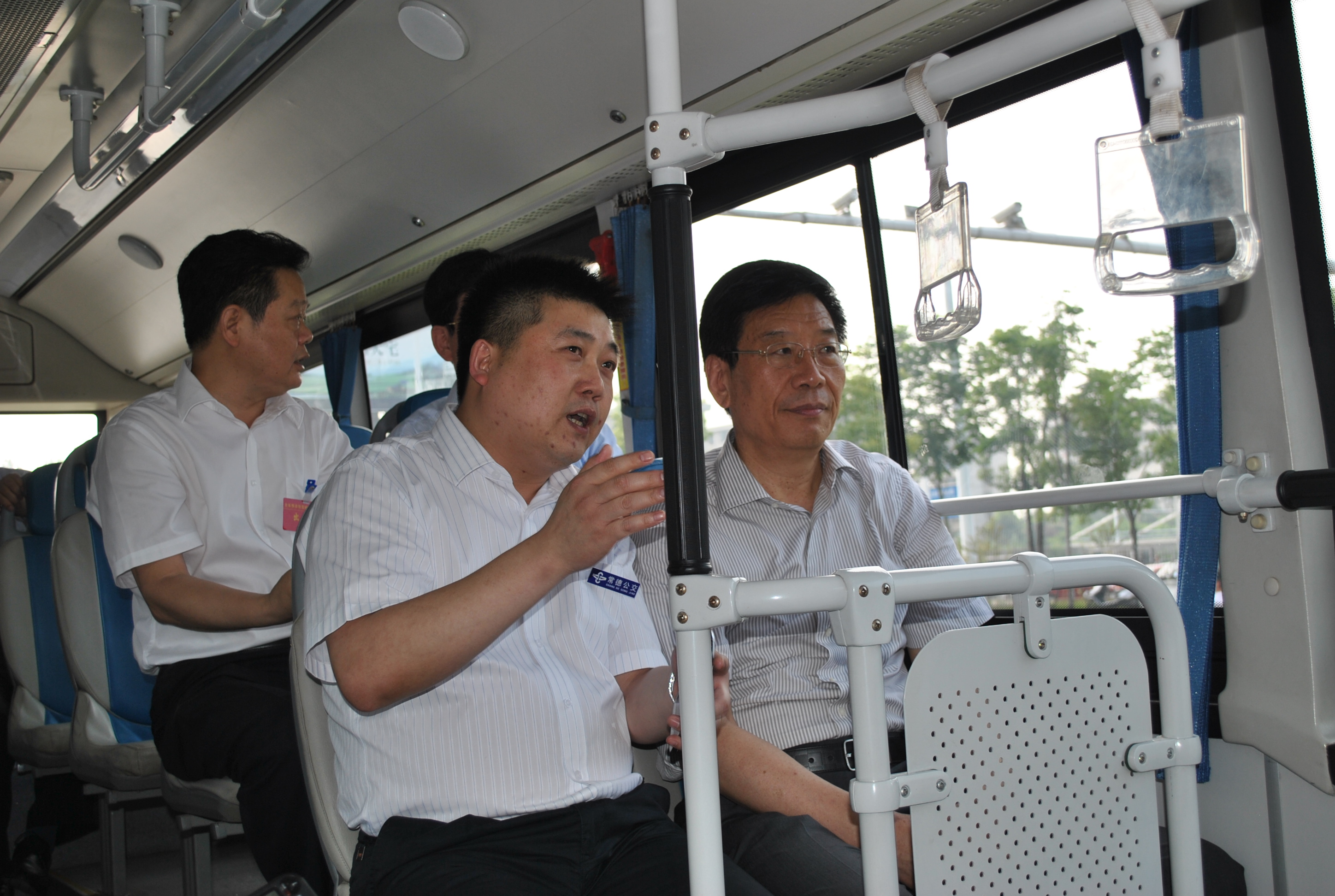 圖為湖南省委書記徐守盛(右一)在快速公交車廂聽取公司董事長(zhǎng)周峰關(guān)于快速公交運(yùn)行情況匯報(bào)