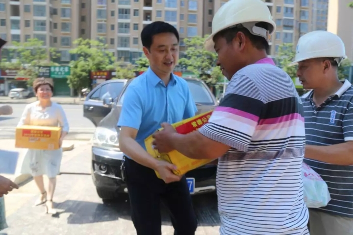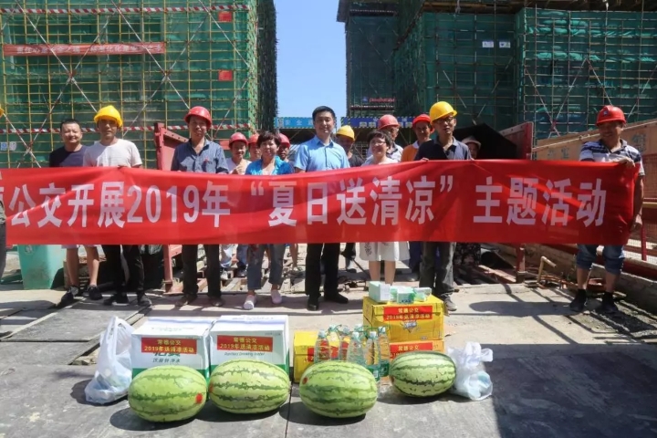 圖為公司領(lǐng)導(dǎo)為場站施工人員送去防暑降溫物資