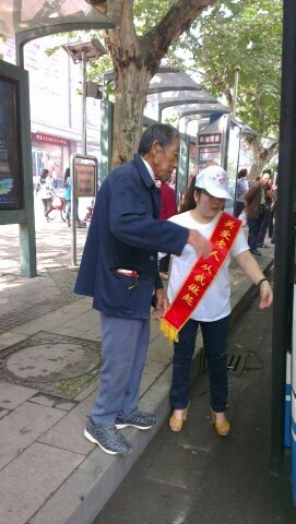 志愿者們身穿白色志愿者T恤,頭戴志愿帽,身佩綬帶,在下南門等客流集中的路段、站點向過往市民發(fā)放尊老敬老倡議書,號召全社會共同參與到關(guān)愛老年人的行動中來。與此同時,志愿者們還在各站點幫助攙扶老年人上下車、過馬路,走上公交車倡導(dǎo)乘客主動給老年人等行動不方便的乘客讓座。公交志愿者們用實際行動傳播倡導(dǎo)尊老敬老文明新風(fēng)尚,成為了繁華市區(qū)一道亮麗的風(fēng)景線。